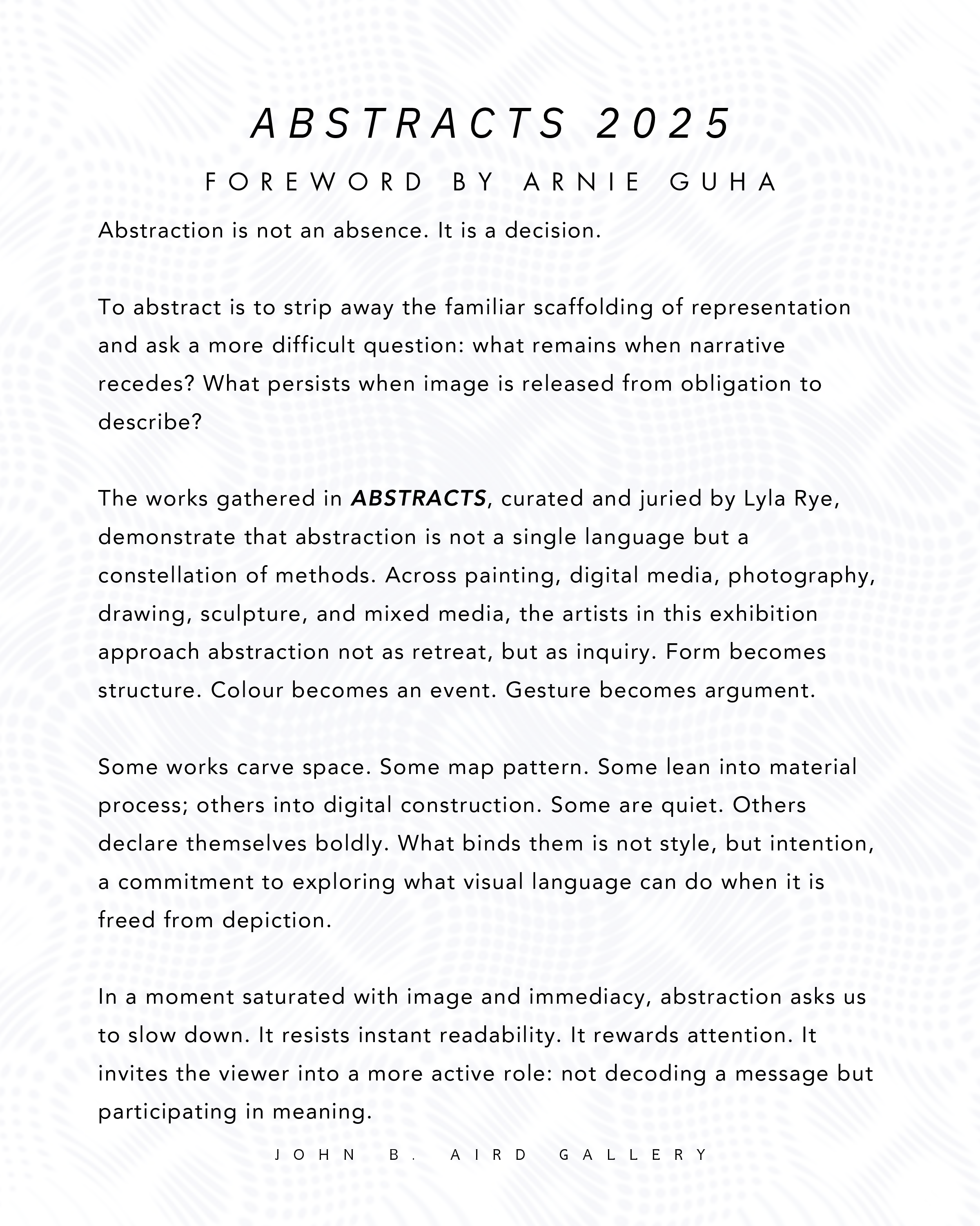 The Aird Gallery exists to provide a platform for artists across Ontario to present rigorous, thoughtful work. ABSTRACTS reflect that mandate fully. It demonstrates that abstraction is not a historical chapter closed in the twentieth century, but an ongoing experiment — one that continues to expand, fracture, and renew itself.