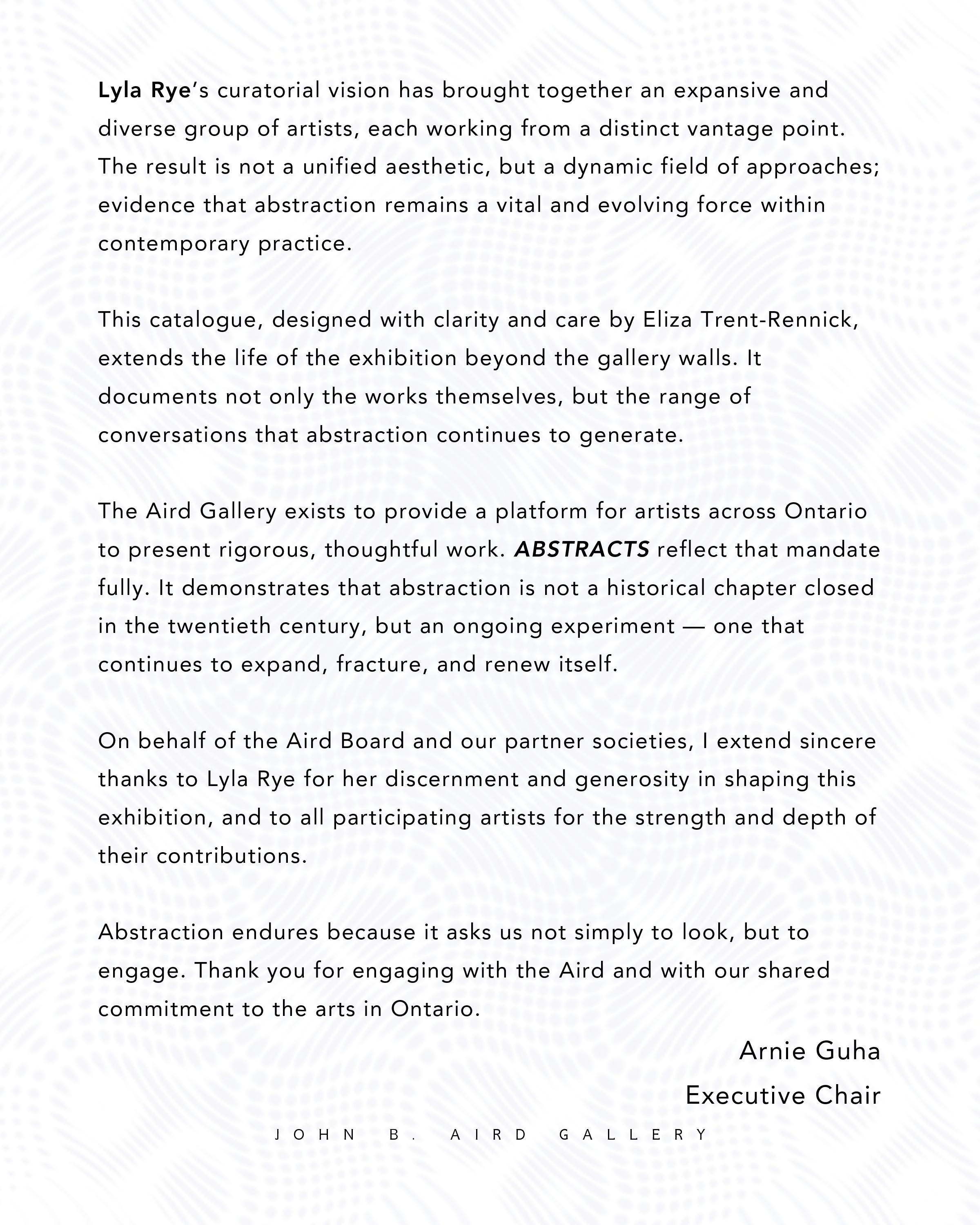On behalf of the Aird Board and our partner societies, I extend sincere thanks to Lyla Rye for her discernment and generosity in shaping this exhibition, and to all participating artists for the strength and depth of their contributions.