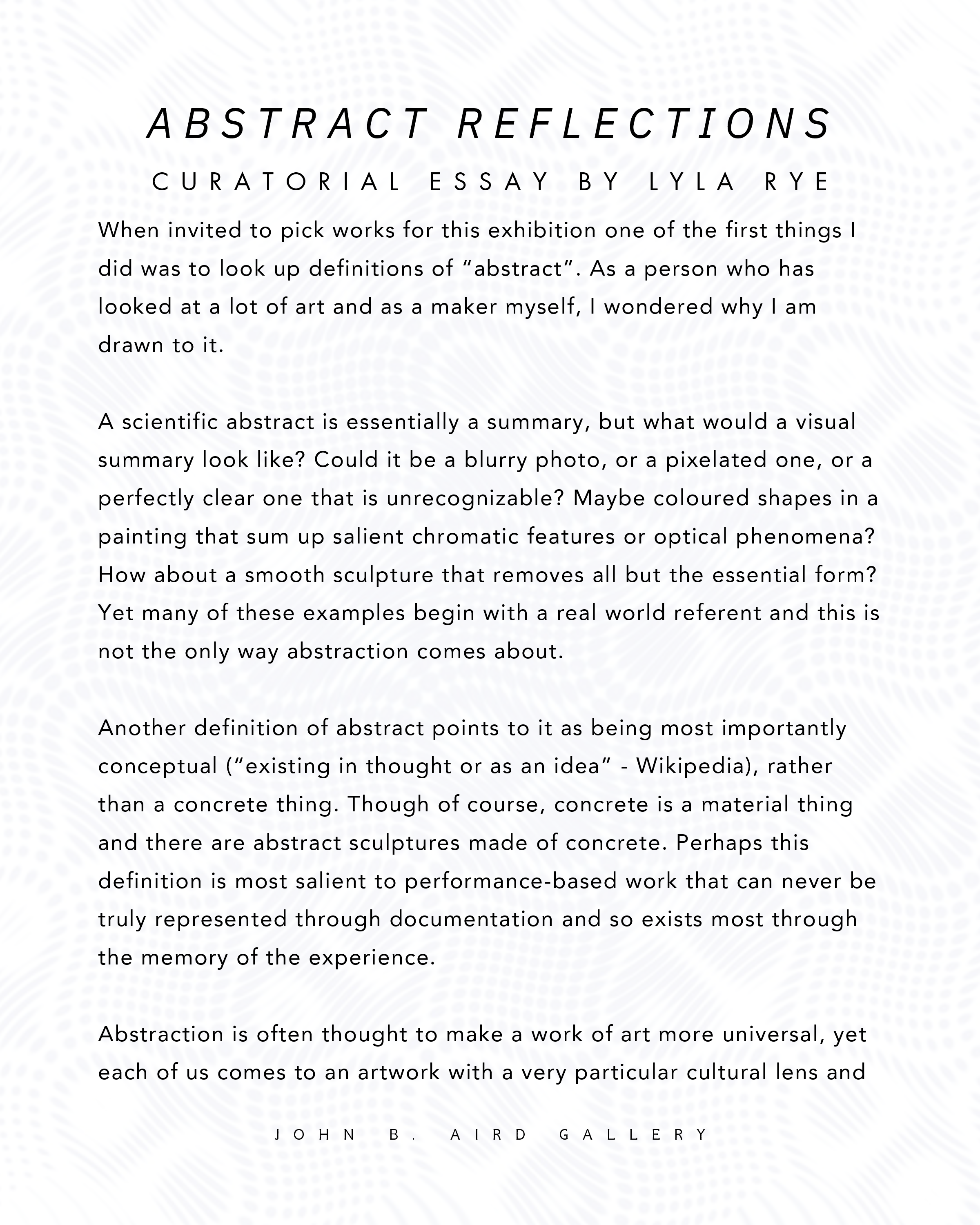 The Aird Gallery exists to provide a platform for artists across Ontario to present rigorous, thoughtful work. ABSTRACTS reflect that mandate fully. It demonstrates that abstraction is not a historical chapter closed in the twentieth century, but an ongoing experiment — one that continues to expand, fracture, and renew itself.