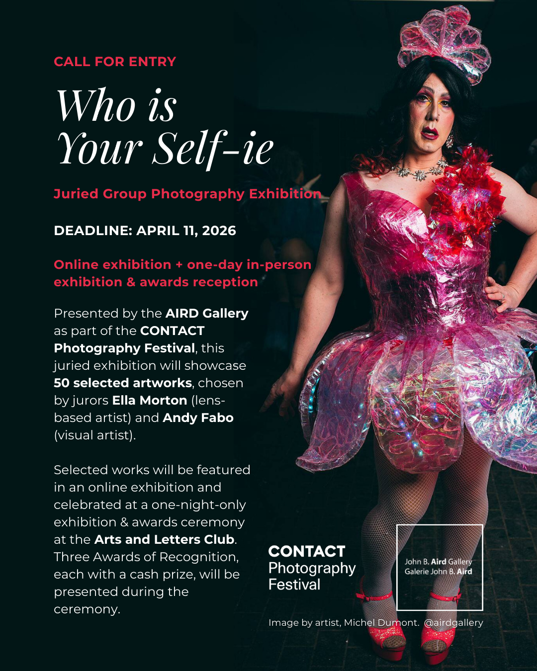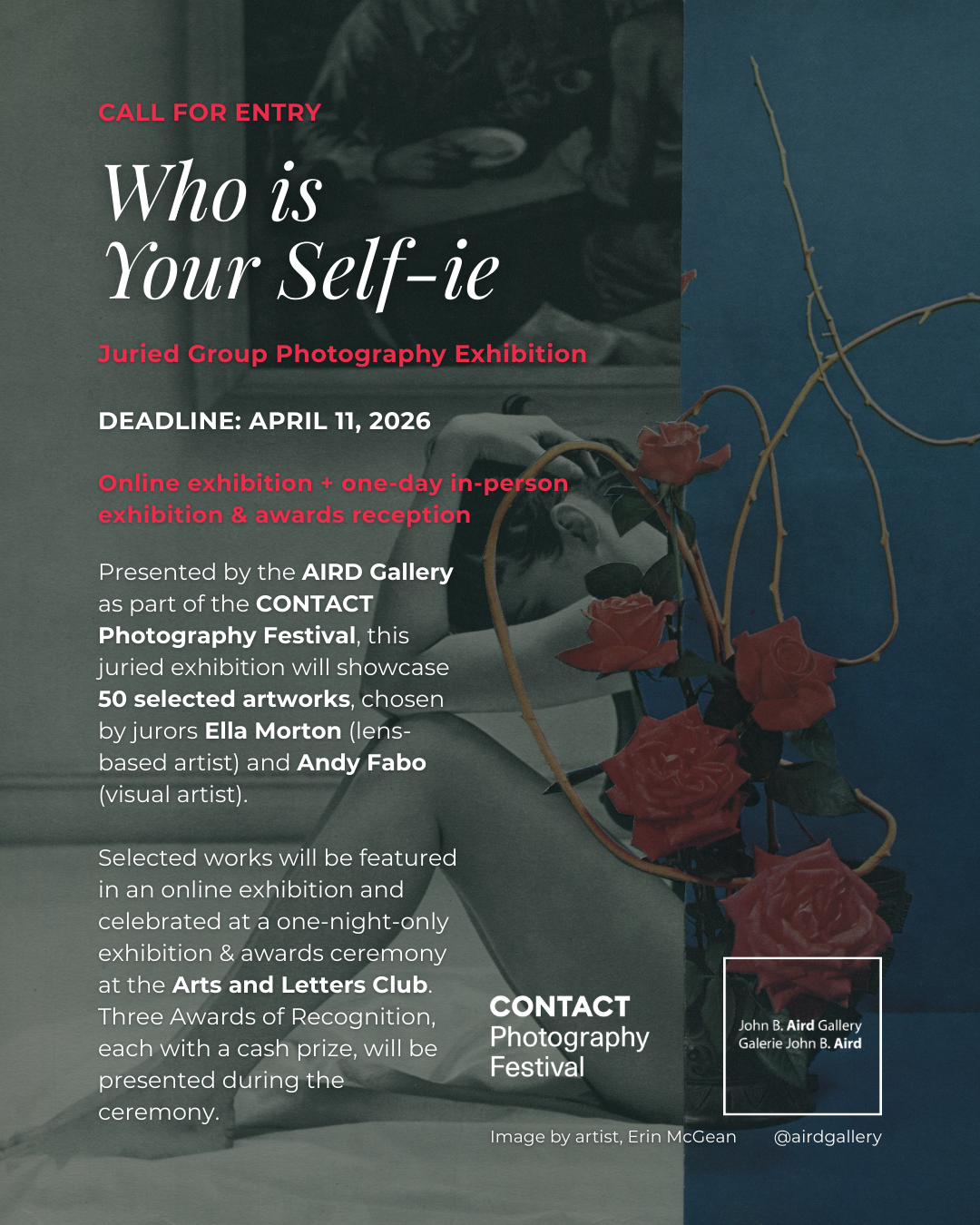 Presented by the Aird Gallery as part of the CONTACT Photography Festival, this juried exhibition features two opportunities: a virtual exhibition and a one-night-only in-person showcase with an awards reception.
